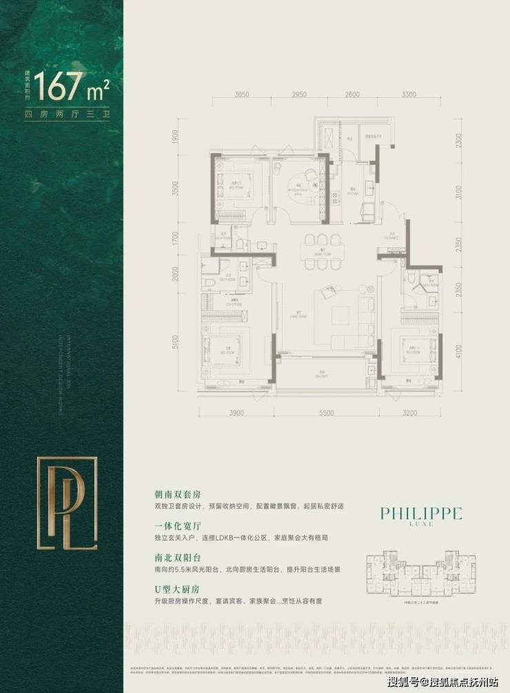 建面约167㎡南厅户型,四房两厅三卫,两梯两户,客厅南向开间5.5米,主卧开间3.9米,厨房北侧还配有小面积阳台。