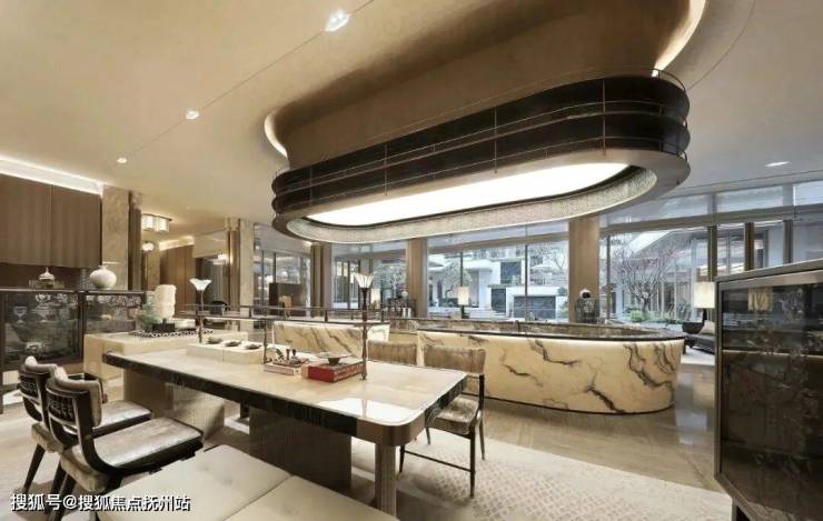 步入门庭,映入眼帘的是由11根高5米多的弧形立柱构成的壮阔空间。这些立柱巧妙环绕,撑起了一个宏伟的藻井,其吊顶采用了精致的透光云石,彰显非凡的气派与匠心独运的设计。中心一棵古桂挺拔繁茂,恭候业主荣耀归府。