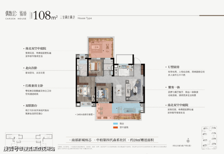 设计亮点:第四代森系社区,奇偶层错位庭院布局(奇数层南向/270°转角,偶数层南北双庭院)