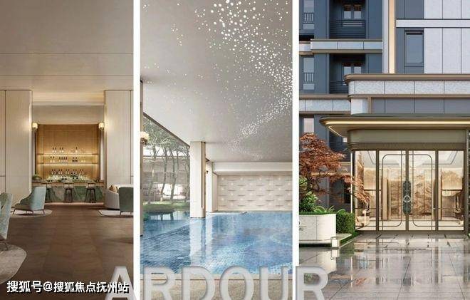 从步入社区大门开始,约70米超大尺度门庭、奢华酒店般的港湾式落客,就将仪式感便顶格拉满;星级酒店大堂,内部多处装置融合非遗技艺美学,生活在尊贵与艺术之间巧妙平衡;进入下沉式中庭花园,归家路上移步异景;单元入户入口延续奢华酒店质感,采用奢石与铝板叠加的奢华设计,碰撞法式圆润线条,仿佛艺术殿堂。