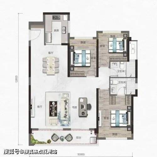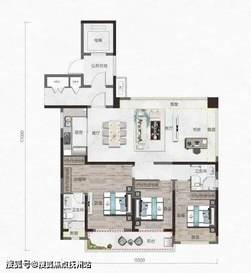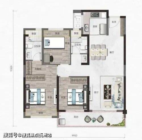 点评:该户型位于7号楼边户,户型方正,三开间朝南,南北通透,动静分区较好。