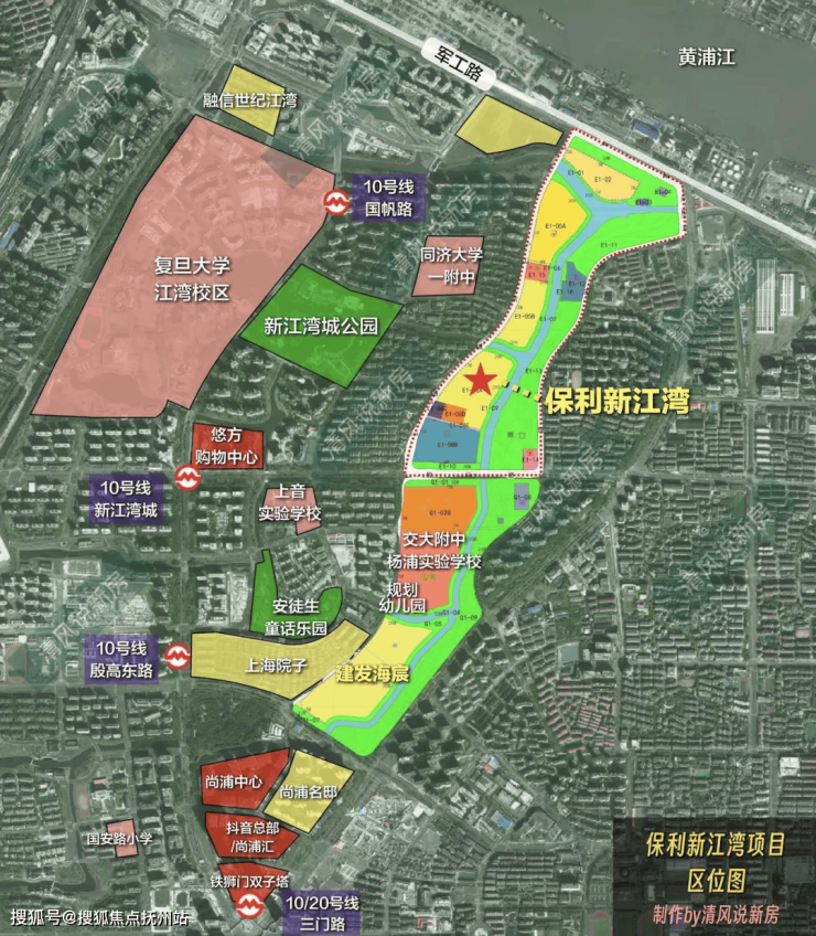 地块西侧就是新江湾顶级别墅项目新江湾城首府和中建大公馆,再西侧则是新江湾城公园与复旦大学。
