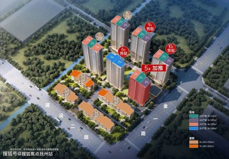 项目位于建设二路与金一路的交会处,依托方正的地形,规划了6幢高层+4幢叠排,其中高层住宅仅356套。户型方面,本次首开的2幢高层(9、10号楼),主推建面约123㎡的中间套,以及建面约129㎡、139㎡的边套,均为四房两厅两卫全明格局。