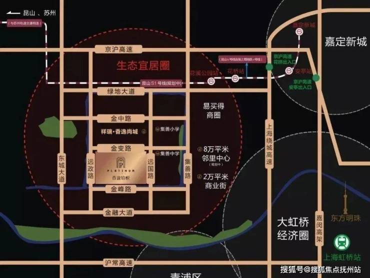 S1地铁站西环路,35万平米花桥梦世界(中国最大5D电影城)、国际展览中心等