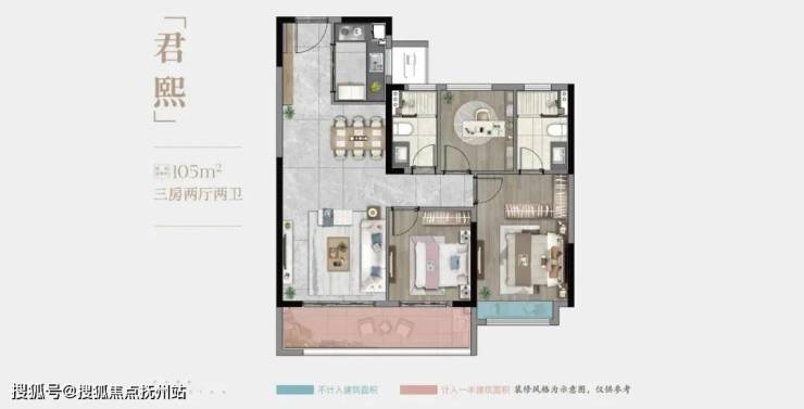 设计户型,本质上就是设计生活。近园最热销户型105㎡,可谓样样精通,面面俱到,出道即爆款,秒杀市场上120-130㎡三房,总价更低,性价比更高。经典三房,动静分离,三开间朝南,明厨明卫。主卧套房设计,步入式衣帽间,独立卫浴,加上飘窗设计,独享私密和尊贵空间。客厅与南向次卧外打造双联阳台,晾晒与观景休闲都能充分满足。