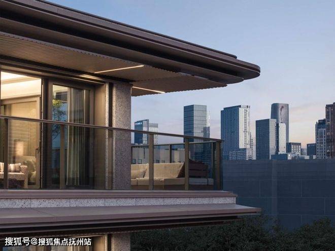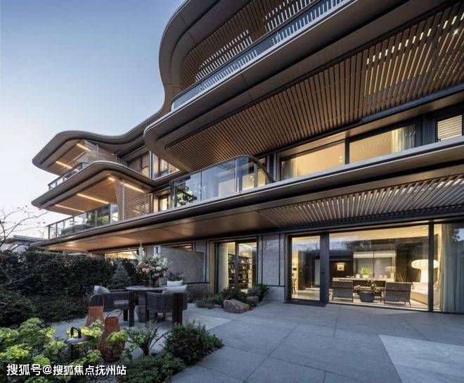 合院采用“超流体”风格的立面线条,搭配金色美学设计以及独特的“木纹转印铝格栅”,让建筑呈现轻盈灵动的未来感。