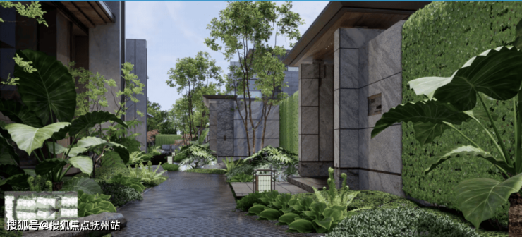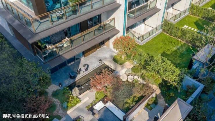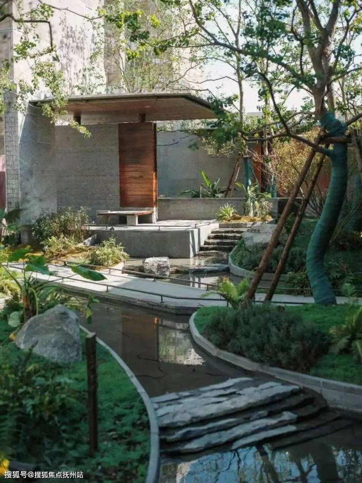 清浅水景映着石板茶区,错落绿植衬得天地敞亮,归家即拥有一方松弛秘境。