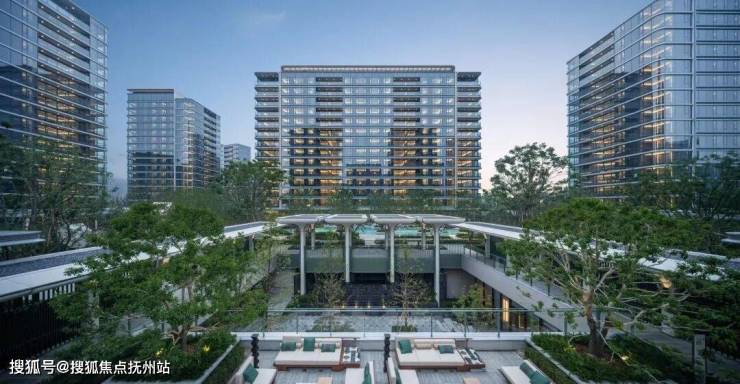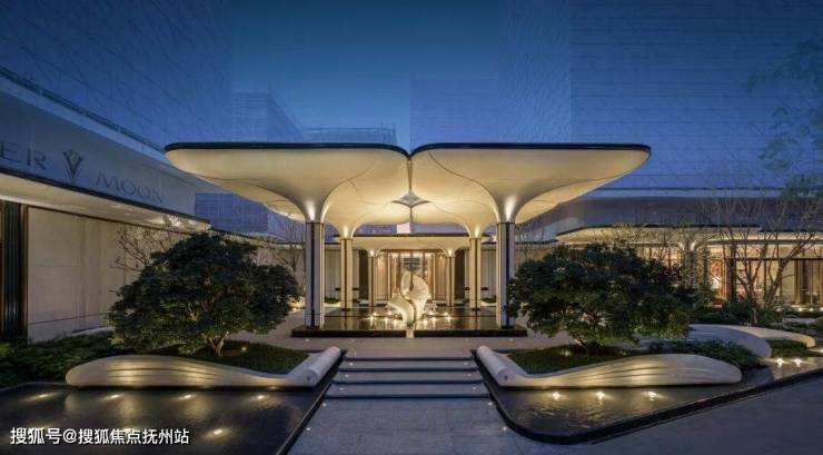 特选价值百万约200年树龄的日本茶梅;采用最长约13米的贝金米黄石材,整石切割的门头水景石材;标志性的芝兰玉树,从2:1到2.6:1进行比例迭新;架空层与街区圆融一体……