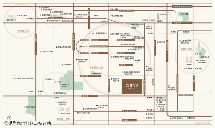 1-1.5公里步行圈:古北1699广场、黄金城道步行街、高岛屋、古北市民中心、体汇+名都体育公园、虹桥高尔夫球场、古北SOHO、程十发美术馆;2.5-3.5公里生活/商务圈:尚嘉中心、南丰城、老外街、世贸商城、徐家汇恒隆、新鸿基ITC、爱琴海购物中心、万象城、仙霞网球中心、西郊宾馆、虹桥迎宾馆、漕河泾开发区;