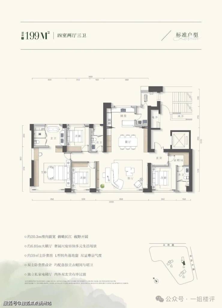 以建面约199平新品户型为例,在此前四房两卫的基础上,升级为四房三卫,以奢阔双主卧套房重构空间哲学。