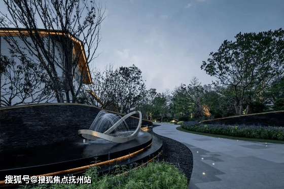 山色从来不世情,水光分与万家清。入口特色跌水景墙, 抽象创意水景雕塑多维形态展现,是静谧的丝带也是开阔水面上一叶乌篷船,迎接着人们入园。 在水景建设初期,项目团队对现场地基进行勘测,发现售楼部周边土方下沉,会引起水景结构不均匀沉降导致很大的漏水风险,他们提前和业主及设计单位建议采用衫木桩打桩,提高地基的压实效果和承载力,最大程度地稳定回填土基层。