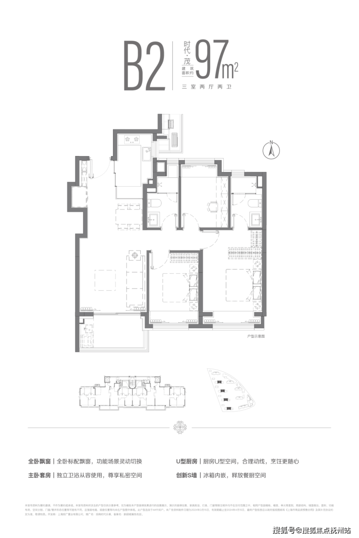 面约97m²三房两厅两卫户型,全卧+主卫飘窗配置,并通过飞机户型空间布局,提升了空间的使用效率,让温情在自然中自然发生。