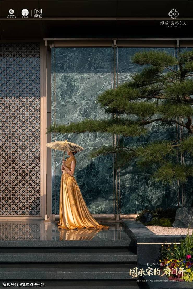 将视线延展,整体构成一幅融贯宋式美学的立体画卷:门庭两侧,两株特选古松苍劲挺拔,以傲然之姿守卫着这处昆山地标门户的庄严气度。