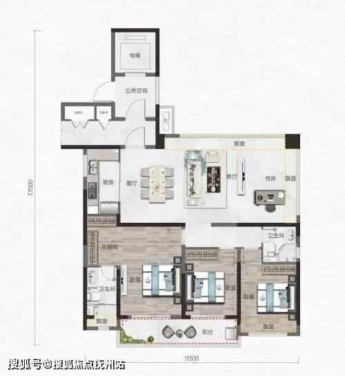 点评:该户型位于7号楼边户,户型方正,三开间朝南,南北通透,动静分区较好。