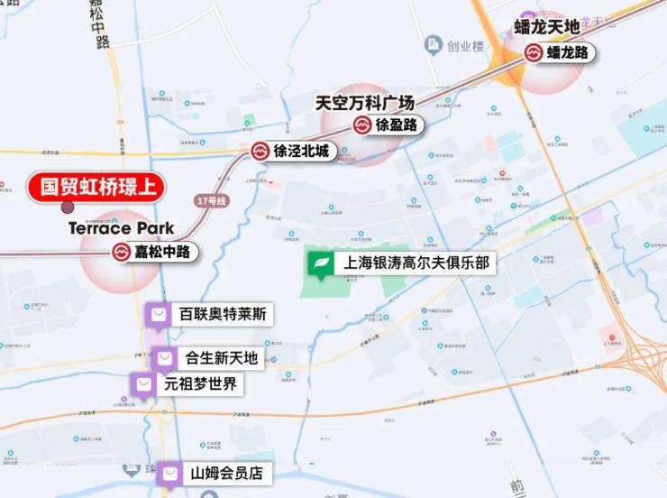 项目周边已成为上海人周末出行的打卡圣地,蟠龙天地、天空万科广场、百联奥特莱斯、合生新天地、元祖梦世界、山姆会员店等商业、休闲综合体一路连缀。