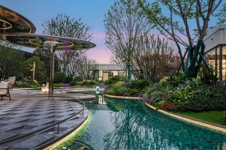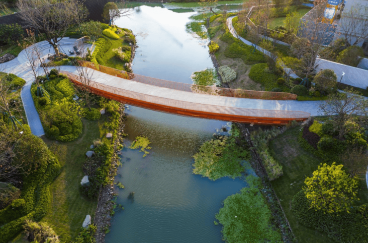 第一,项目由两条天然水系穿流而过,形成三座天然“岛屿社区”,开发商在三座“岛屿”设置不同主题,并铺陈丰富的景观节点。