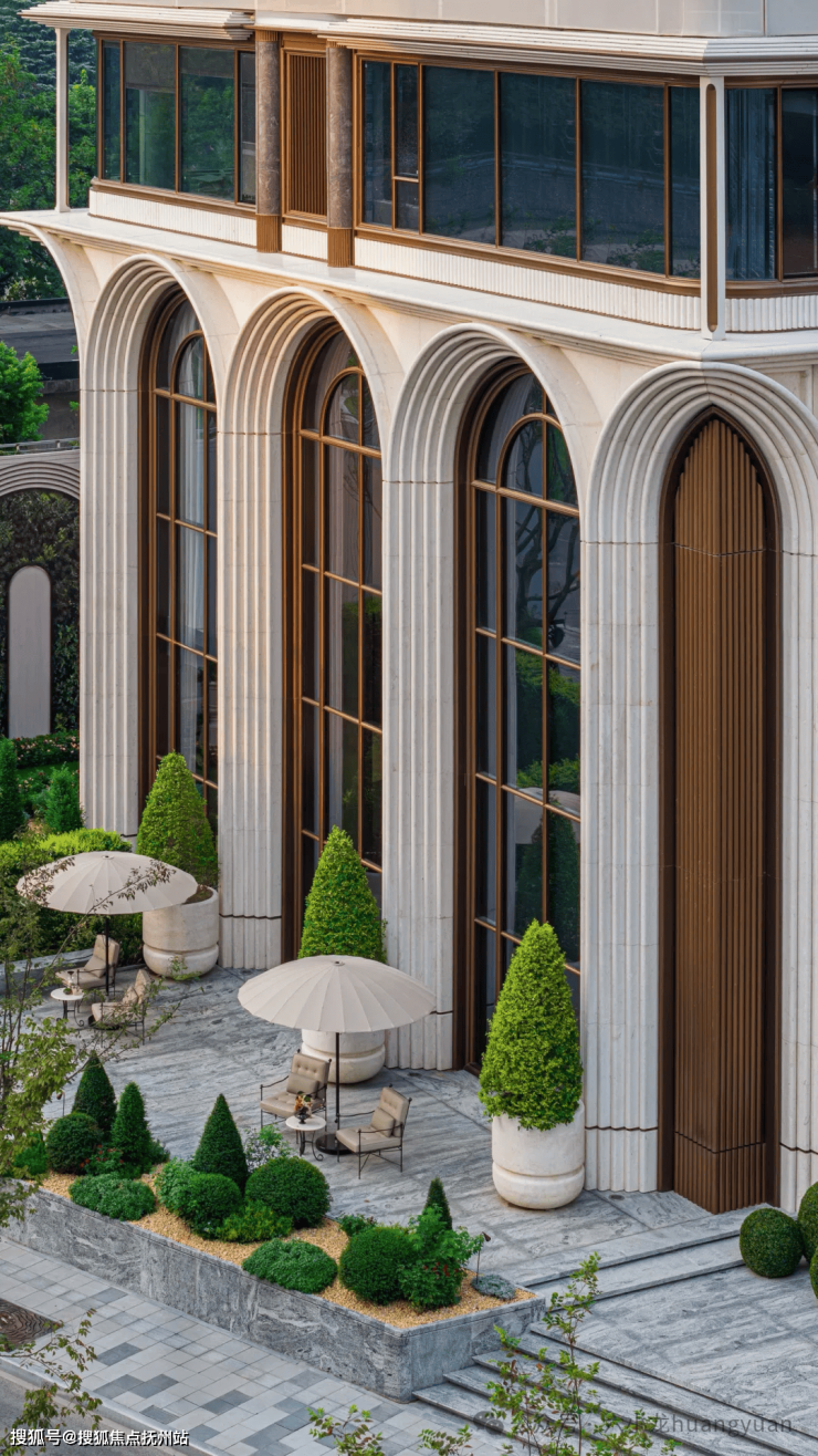 项目采用12米高拱券大门、宝格丽绿石材与古铜金属线条交织,形成迎宾序列;意大利贝金米黄石材弧形景墙与铜马雕塑传递“龙马精神”寓意