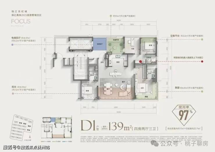 先看建面约139㎡四房三卫户型。LDKB的户型设计;封包阳台+主卧L型飘窗;双套卧、三卫;南向超大开间;专梯专户、尊享电梯前厅...
