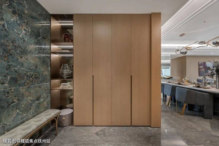还有玄关处的定制孔雀绿岩板,漆皮木饰墙面,精工细致的透光展示柜、香槟灰收纳柜以及无处不在的PRADA绿、亚马逊绿奢石……