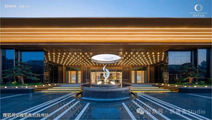 一进小区大门,晓月沁园的温馨归途,从50米宏伟的[兰花邀月]大门揭开序幕:借鉴顶级五星酒店的落客礼仪,营造出尊贵的归家仪式。两旁延伸的幻影蓝奢石景墙,精选自欧洲珍稀石材,于光与影交织中绽放璀璨的星辉蓝芒。抬头瞻仰主入口的星空之顶,香槟金铝板精心勾勒的“圆满月”镂空圆顶之下,一尊以市树广玉兰为灵感源泉的玉兰雕塑悬浮其中,营造出“月华如洗”般的清雅意境。