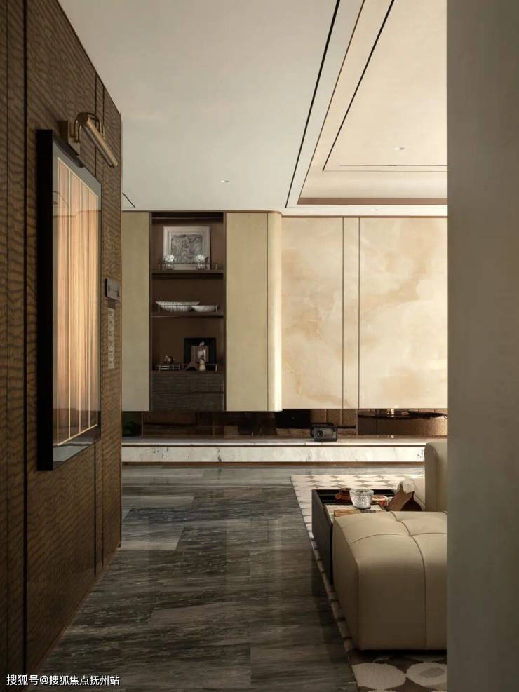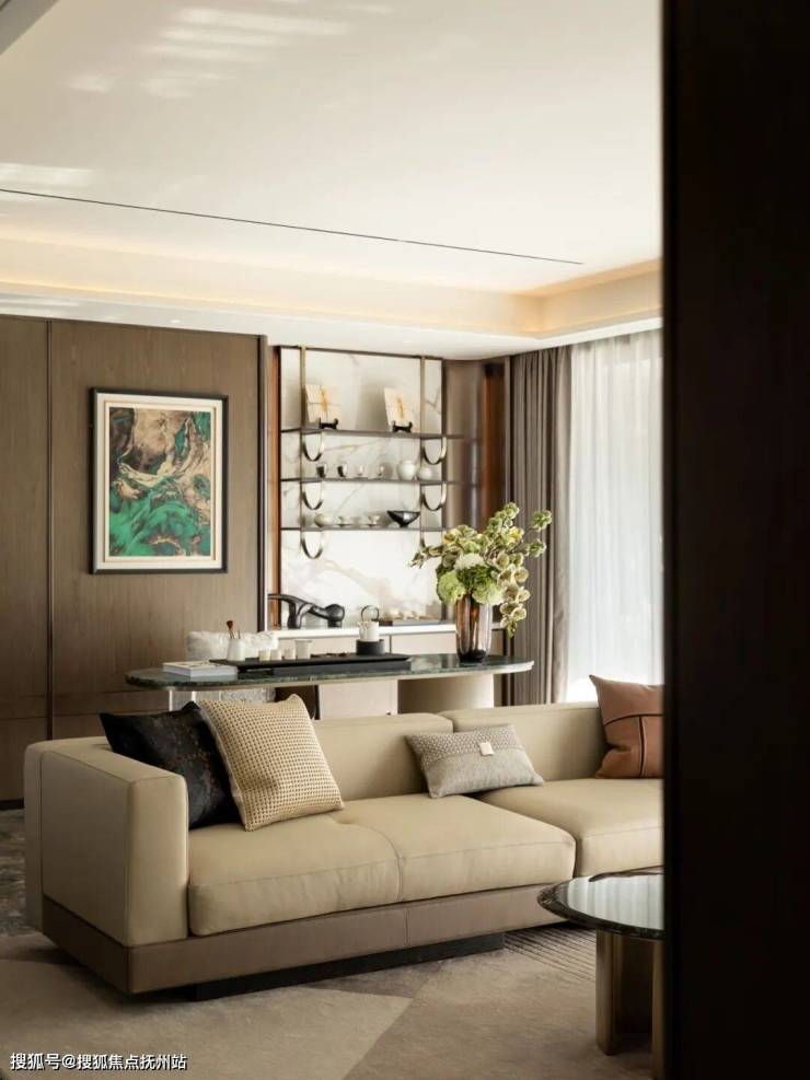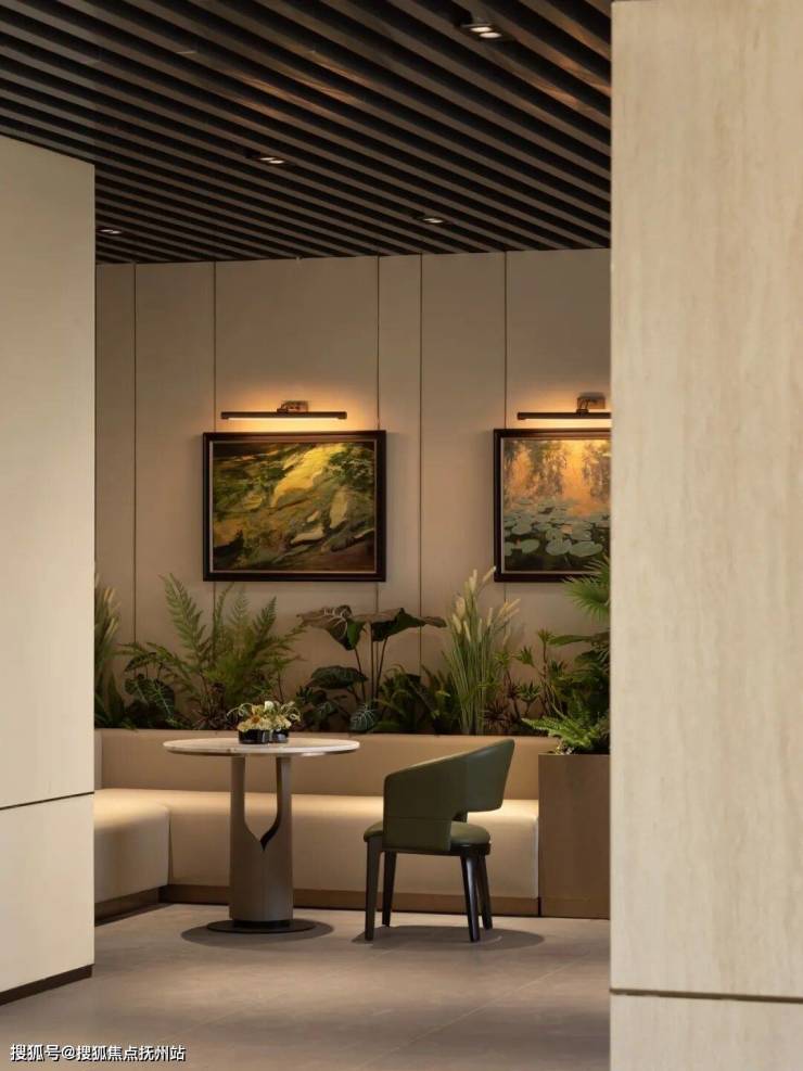 繁忙工作之余,漫步于艺术品展览区,柔和的米色调与木质材质,更添一份静谧而包容的从容雅致。