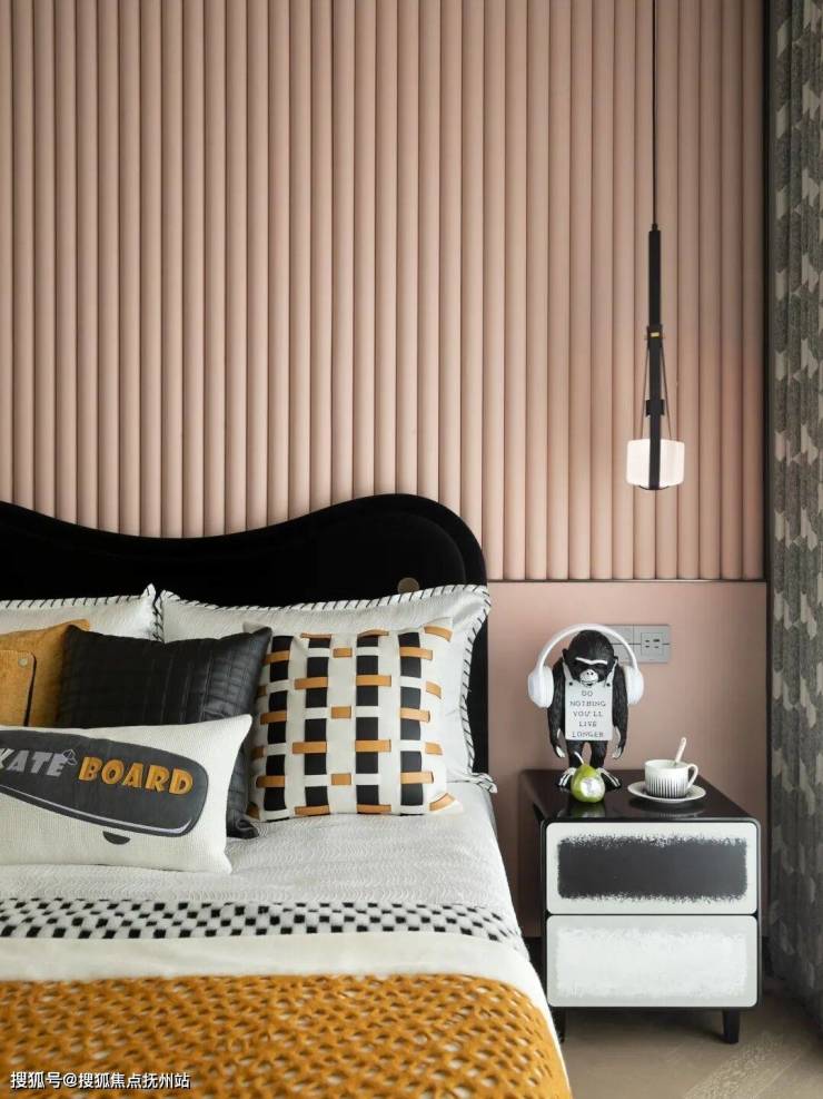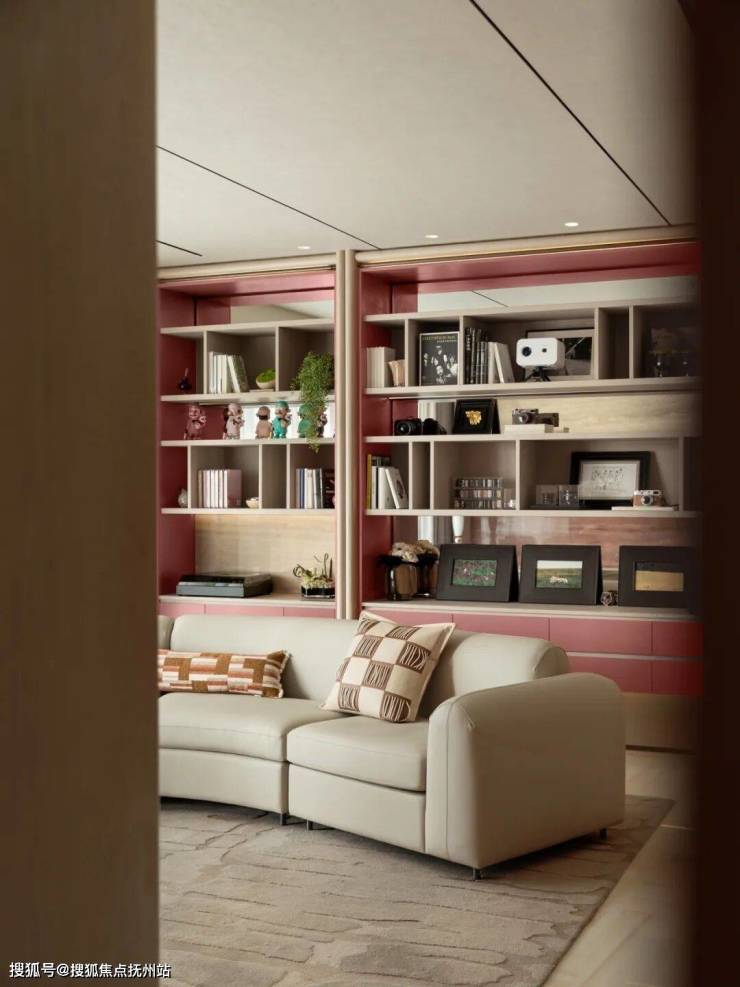 143㎡户型,客厅的吊顶设计与金属收边,以现代手法平衡了石材的厚重感,黄玉电视背景墙勾勒自然纹理,整墙书柜兼顾收纳与艺术陈列。主卧以米色与棕色为主调,米色护墙板通过竖向线条设计延伸视觉高度;儿童房以柔和粉色为主调,整体布局兼顾多种功能,打造实用又充满欢乐的成长空间。