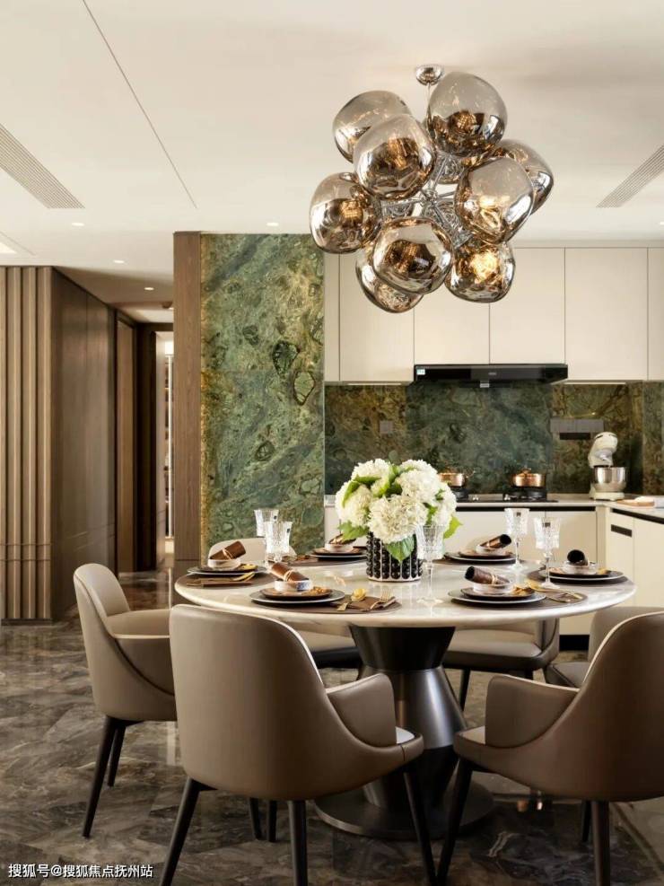 188㎡户型,客餐厅一体化设计,威尼斯棕大理石拼花地面延伸视觉张力;厨房区域的绿宝石纹理墙面与大理石橱柜相互映衬。男孩房以灰蓝色为主色调,墙面的竖线条设计,赋予空间疏朗的气质;女孩房浅粉色的竖条纹背景墙,温馨浪漫。