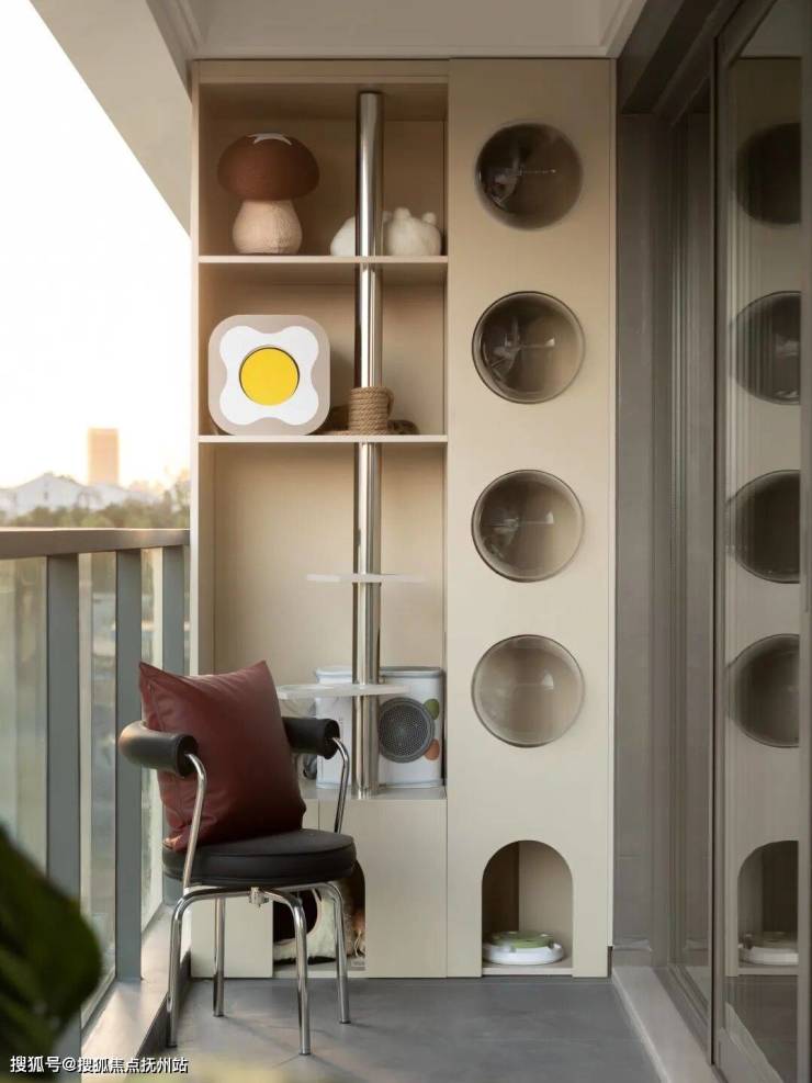 118㎡户型,客餐厅、厨房通过开放式布局,为业主提供开阔、通透的居住体验。沙发曲线自然灵动,与规整的柜体相互映衬;主卧氛围静谧,次卧温馨柔和;阳台作为“猫主子”的专属领地,充分满足猫咪“攀爬-跳跃-躲藏-观察”的生活习性需求。
