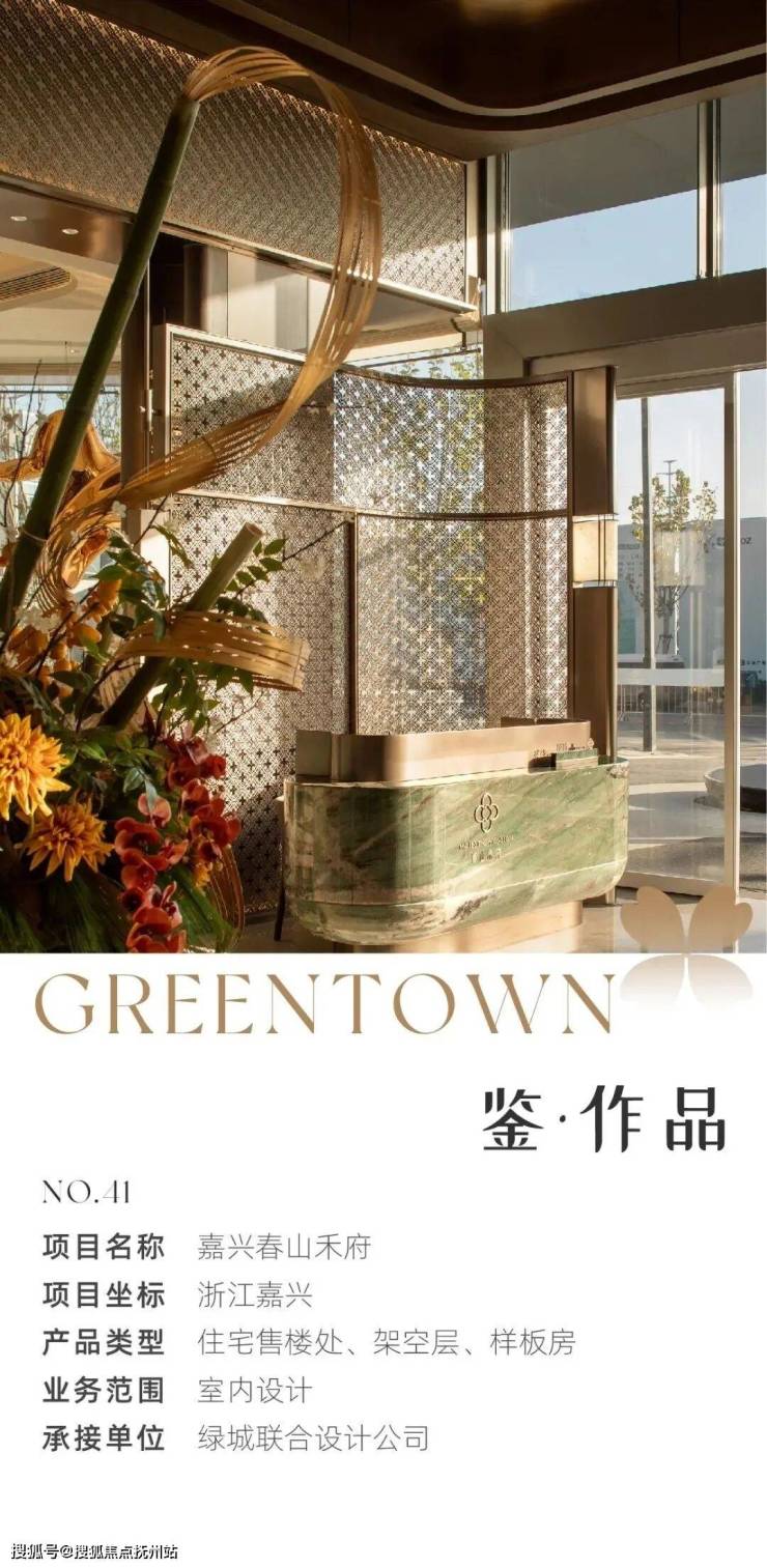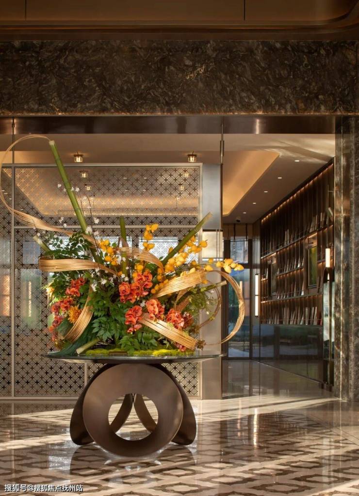 镂空的金属纹理,翠绿色大理石纹,为空间增添层次感。大型花艺作品《嘉禾》,以黄金果、竹子、蝴蝶兰为花材,展现草长莺飞的春日景象,赋予项目庭盈福瑞的美好寓意。