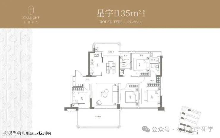 先看建面约135㎡(偶数层),做到了4房2卫+4开间朝南,南北双阳台,主卧大套房,具备改善型四房应有的一切优点。