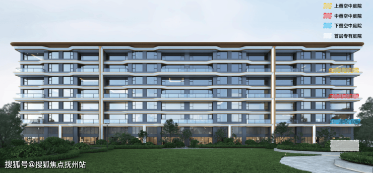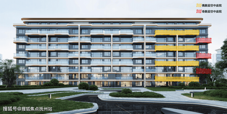 宜禾春江府的8栋住宅,全部采用奇偶层错列式排布,每户都拥有两层挑高的空中庭院,形成“双空中庭院”。
