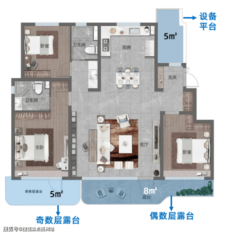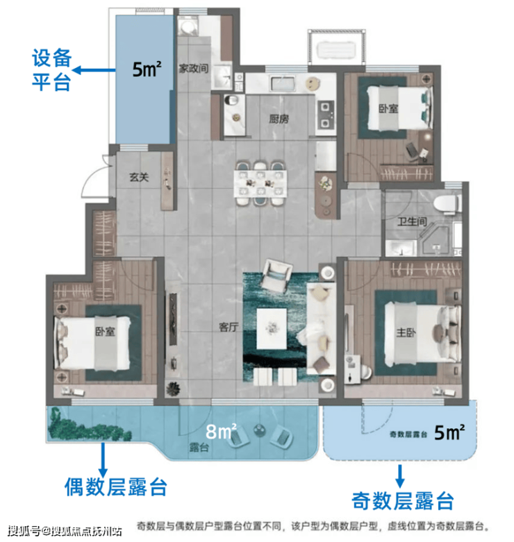 而建面约126㎡的三室两卫,(偶数层)得房率93%(奇数层为90%)。约5㎡的设备平台、约8㎡的露台(偶数层)全赠送(奇数层露台约5㎡),赠送面积合计约13㎡(奇数层约为10㎡)。