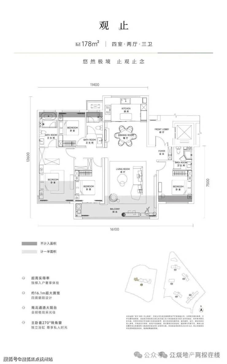 建面约178平户型,优化后得房率约94%。独立电梯前室入户,双套房,厨房开间比较大。该户型属于早期比较常规的四代户型,除了阳台相对于三代略大一些,其他并无设备平台、花池等优化赠送,是常规的大开间南北通透结构,也不如B地块户型来的有创意。