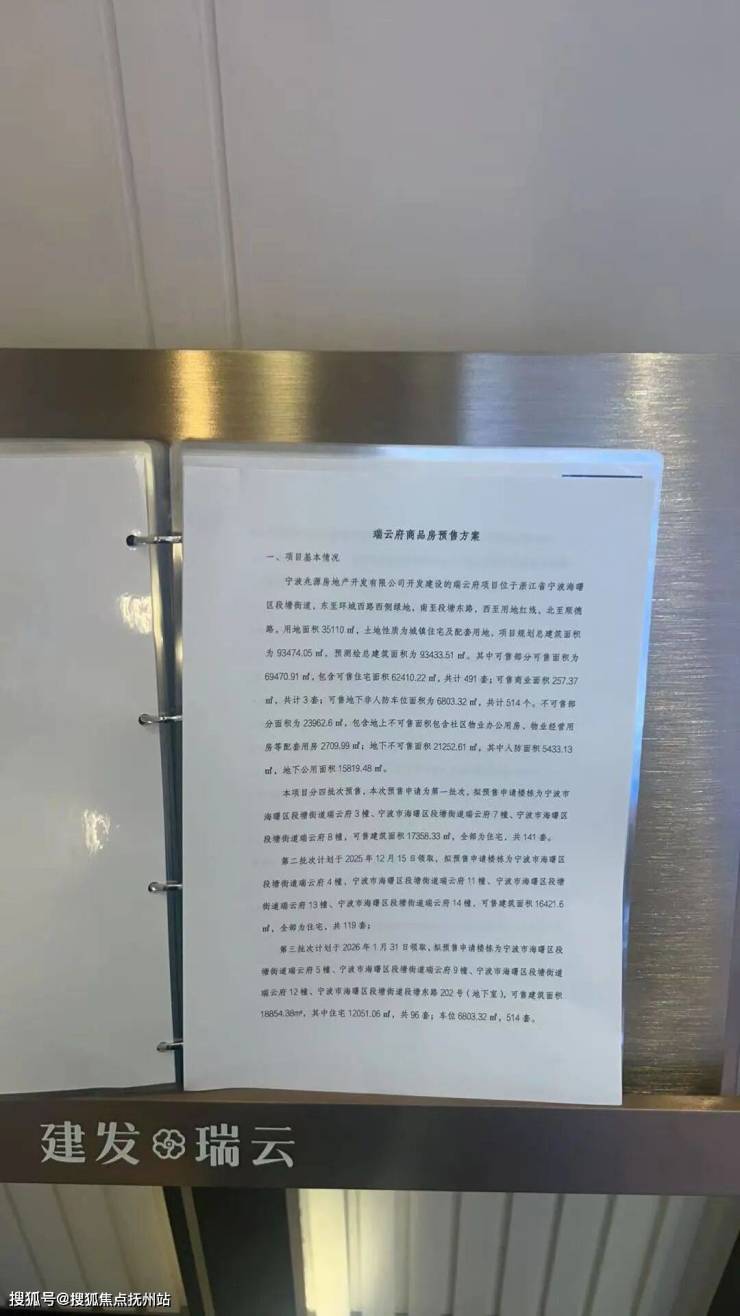第三批次计划于2026年1月31日领取,拟预售申请楼株为宁波市海曙区瑞云府5幢、宁波市海曙区段塘街道瑞云府9幢、宁波市海曙区瑞云府12幢、宁波市海曙区202号(地下室),可售建筑面积18854.38m,其中住宅12051.06㎡,共96套;车位6803.32㎡,514套。