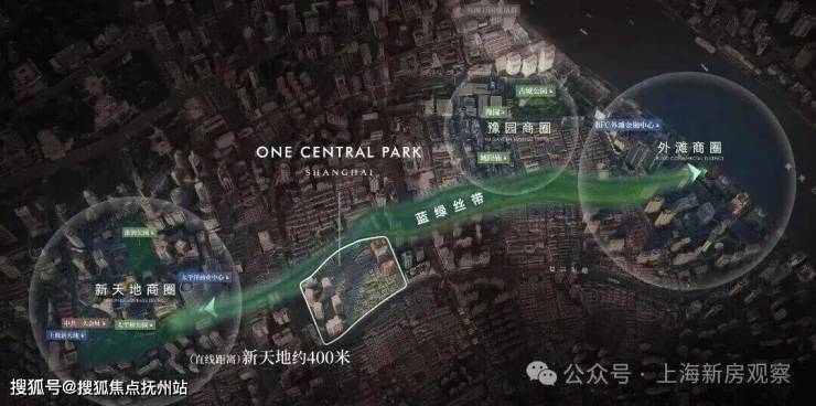 咫尺新天地 蓝绿丝带上的关键节点距离新天地直线距离约400米,作为蓝绿丝带规划上的关键节点,随着大新天地东进南拓战略逐步实施,通过水景、绿地和公共空间,串联新天地、豫园、外滩三大世界级商业版图。