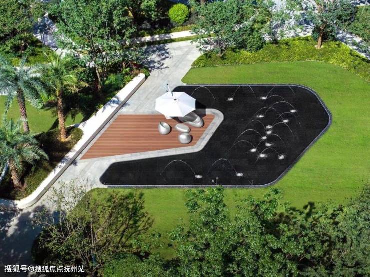 再进而来到灵动跳泉区域,开阔的观赏草坪加上愉悦的喷泉水景,在舒适的木平台造就一片悦享休闲之地。南侧的森林户外影院与儿童活动提供户外活动休闲的空间,在这里享受自然、增加亲子互动、满足亲子交流与儿童交友成长。