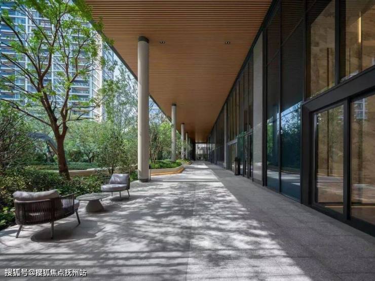 园区入口9米挑高的风雨连廊紧密衔接,无断点覆盖园区内景观,风雨无阻的回家路。悄然徘徊于连廊,将自然引入廊架空间,围炉夜话聆听夜晚的低语,与故事中的人物相遇,在岁月流转中感受诗意相伴。