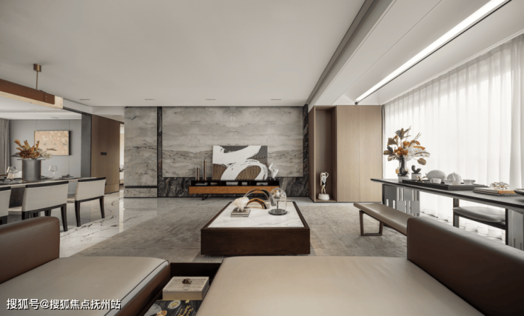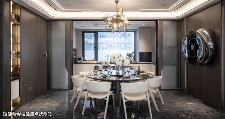 户型采用餐客厅一体贯通设计,空间约60㎡,尺度恢弘,尽显门第威仪。