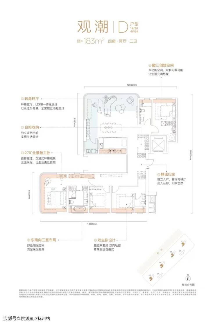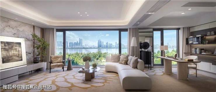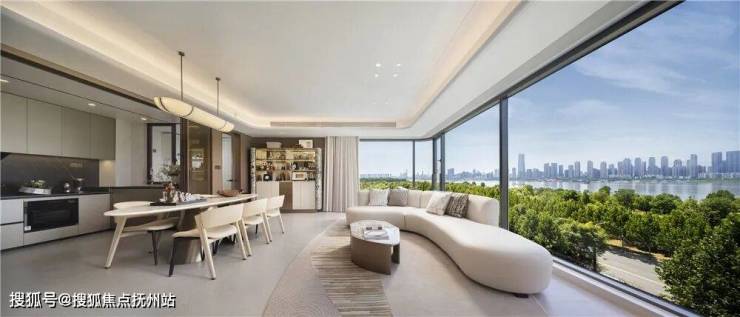 整个项目,每户住宅层高做到3.05米,每户沿江面均配置全景落地LOW-E玻璃幕墙,实现约7.4—9米的看江横厅、全景舱270度无界观江体验。