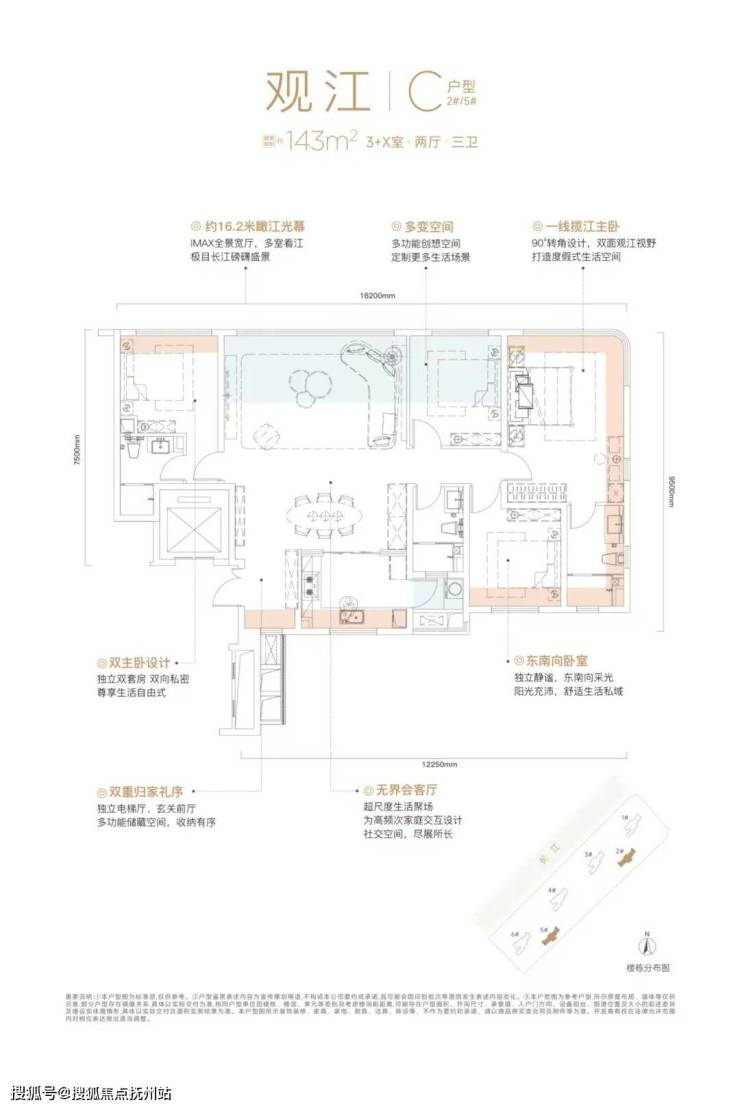 建面约143㎡户型面宽罕见做到了约16.2米,形成IMAX巨幕观江面。