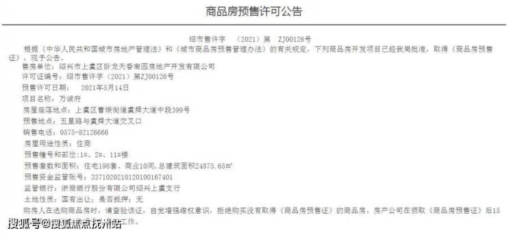 预售套数和面积: 住宅198套、商业10间,总建筑面积24875.65㎡