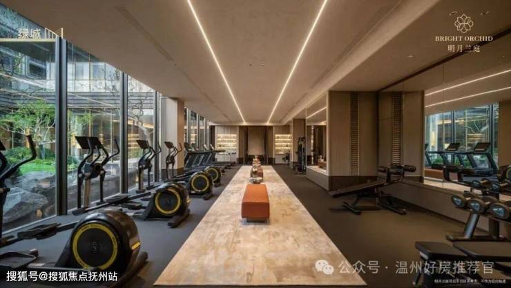 健身房的跑步机和椭圆仪放在大落地玻璃边,真的羡慕这里的业主可以一边看庭院景观一边运动。