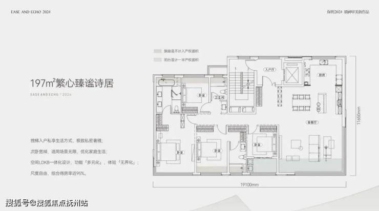 197㎡户型,四房两厅三卫,双套房设计;南向面宽高达19.1米,四面采光通风,通透性极佳;阳台进深约2.4米,双阳台加上多个飘窗,优化后得房率约95%,如果加上电梯前室的面积,得房率也可以做到接近99%。