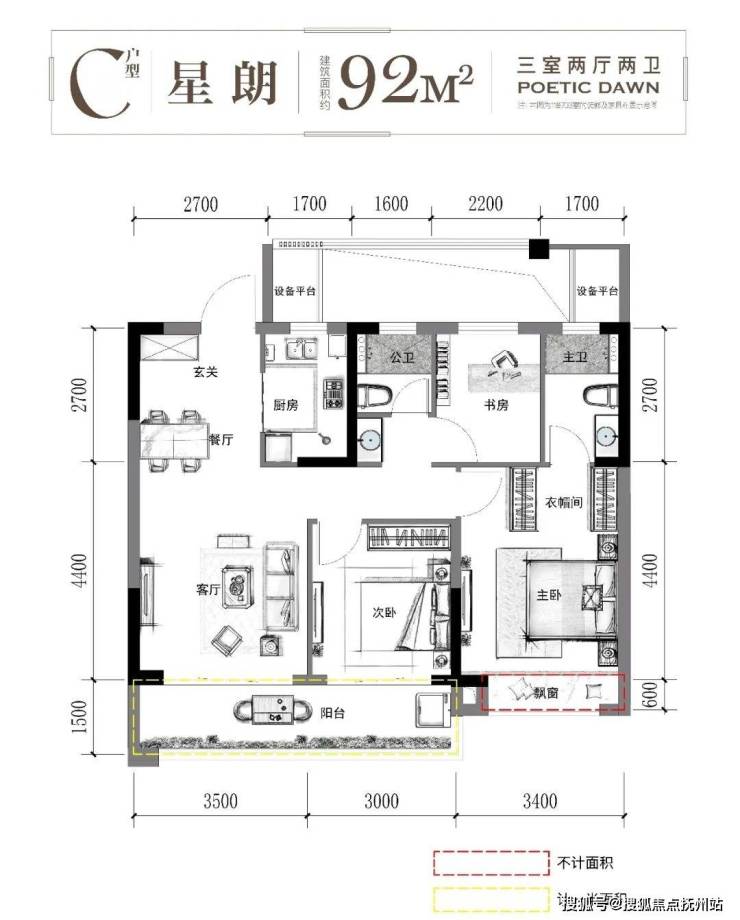 经典主力户型92 m²,三房两厅两卫设计,是一个成长型户型。