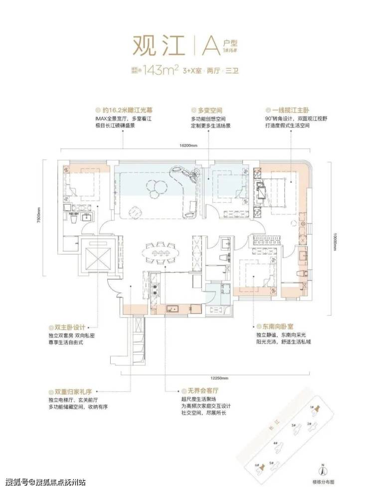 全景舱户型革命:重新定义江景价值:如果说布局创新解决了“能否看江”的问题,那么户型设计则回答了“如何更好看江”。江南岸主推143㎡和183㎡四房三卫户型,打造出武汉少见的“双全景舱”观江系统;143㎡户型实现约16.2米IMAX级观江面,客厅、次卧及双主卧四开间朝江;东主卧更采用弧形转角窗,达成270°双面观江。而183㎡“观潮”户型则配置270°全景舱式主卧+7.6米环幕厅,三面采光主卧可同时享受南向日照与北向江景。