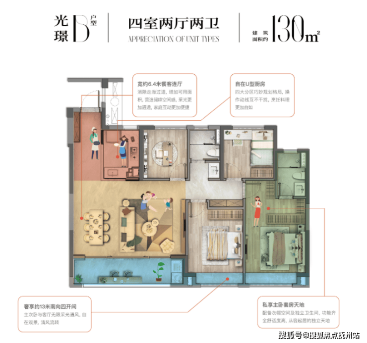 主楼基座采用蓝眼睛石材,外立面双c设计,部分铝板材质,高级简约且富有秩序性。更舒适- 相比高层产品,小高层层高不超18层,12-17F整体户型更方正,南北通透性更好,居住舒适度、私密性更好。更低密- 约1.8容积率,四季花园景观打造,让生活时刻亲近大地与自然。