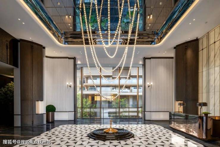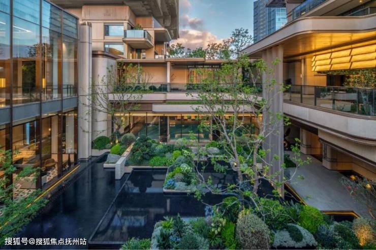 穿过气派的门头,超 10m 高的上下联动水帘瀑布,恢弘而又独具特色,视线自然过渡到约2200㎡超配独立会所。这一下沉式社交空间与入口景观形成巧妙呼应,完美阐述了“内外兼修”的设计哲学。