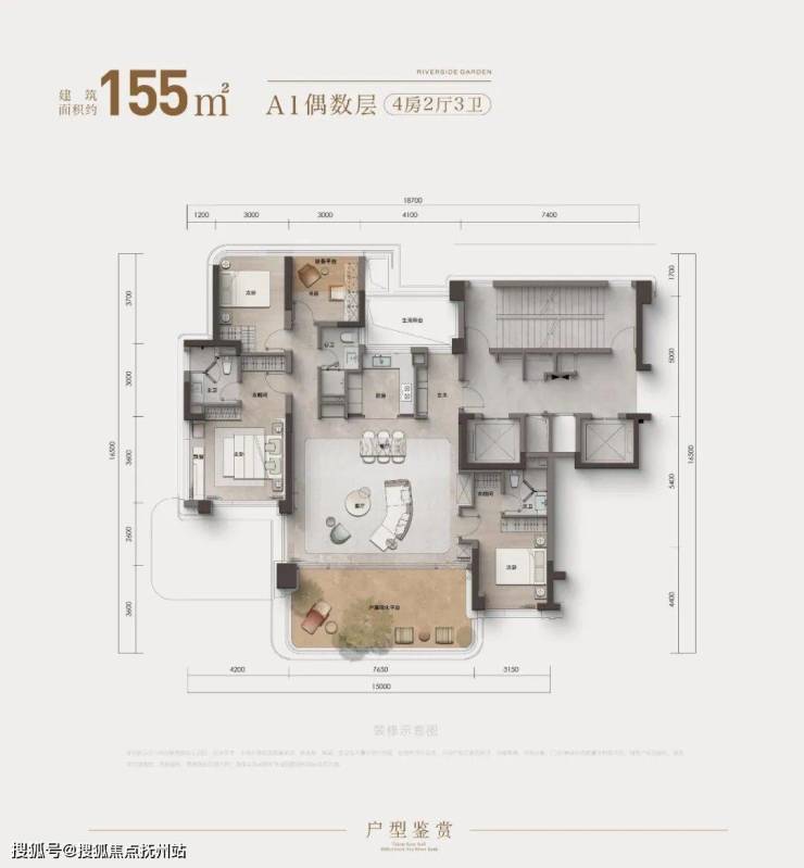 约155㎡偶数层户型采用四房三卫布局,南向面宽约达7.65米,这样的面宽尺度,在宁波其它同等户型中首屈一指,同时客厅南向衔接近27㎡超大露台,打破空间界限,适配各种兴趣生活场景。