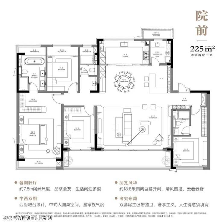 约225㎡户型,客厅面宽达到约7.5米,整体南向开间更是达到约18.8米,尺度那是一点问题没有!该户型还配备了中西双厨、南向双联阳台、双套房,不过这种尺度感,还是要去现场体验一下!