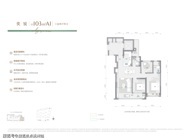 项目打造建面约100-175㎡奢适户型。所有户型均遵循“南向最大化+灵活空间”原则,南向面宽最大达15米,部分户型配备270°环幕观景阳台。